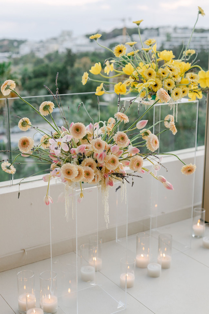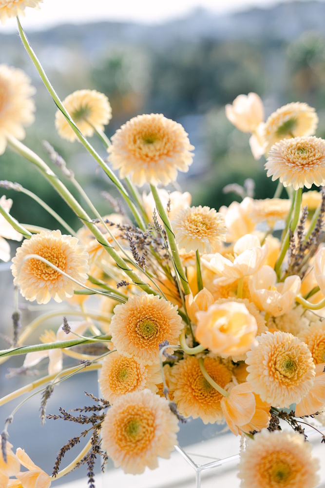 Drawing inspiration from Emmanuel’s heartfelt words about his love for Amy, we curated a setting that mirrored their essence: elegant, minimal, and artfully refined. A fresh spring palette of soft pinks, mauves, and yellows bloomed through Amy’s favorite flowers, gerberas, beautifully arranged on tall floral pillars with soft candlelight and a sleek, modern table setting.