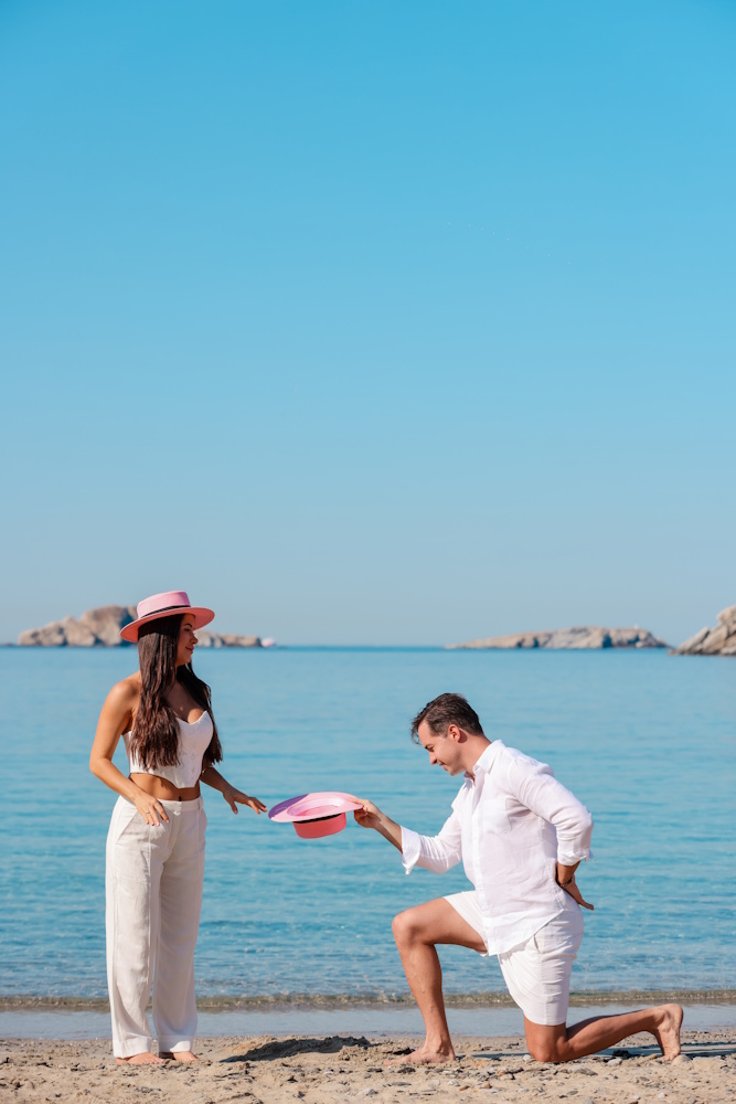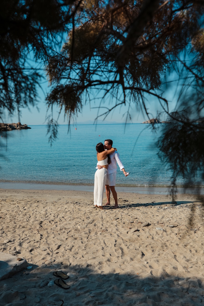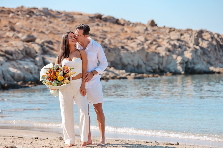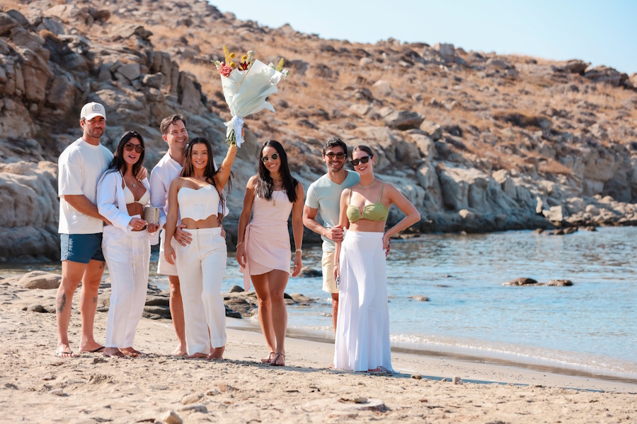 The couple arrived on the morning of the event to an unusually calm and quiet Mykonian seascape – soft light, still waters, and, remarkably, no wind at all. It was the perfect backdrop for what was to come. Their closest friends gathered to share in the joy, just days after the couple’s doctor appointment. Excitement was in the air, and anticipation had been building for weeks.